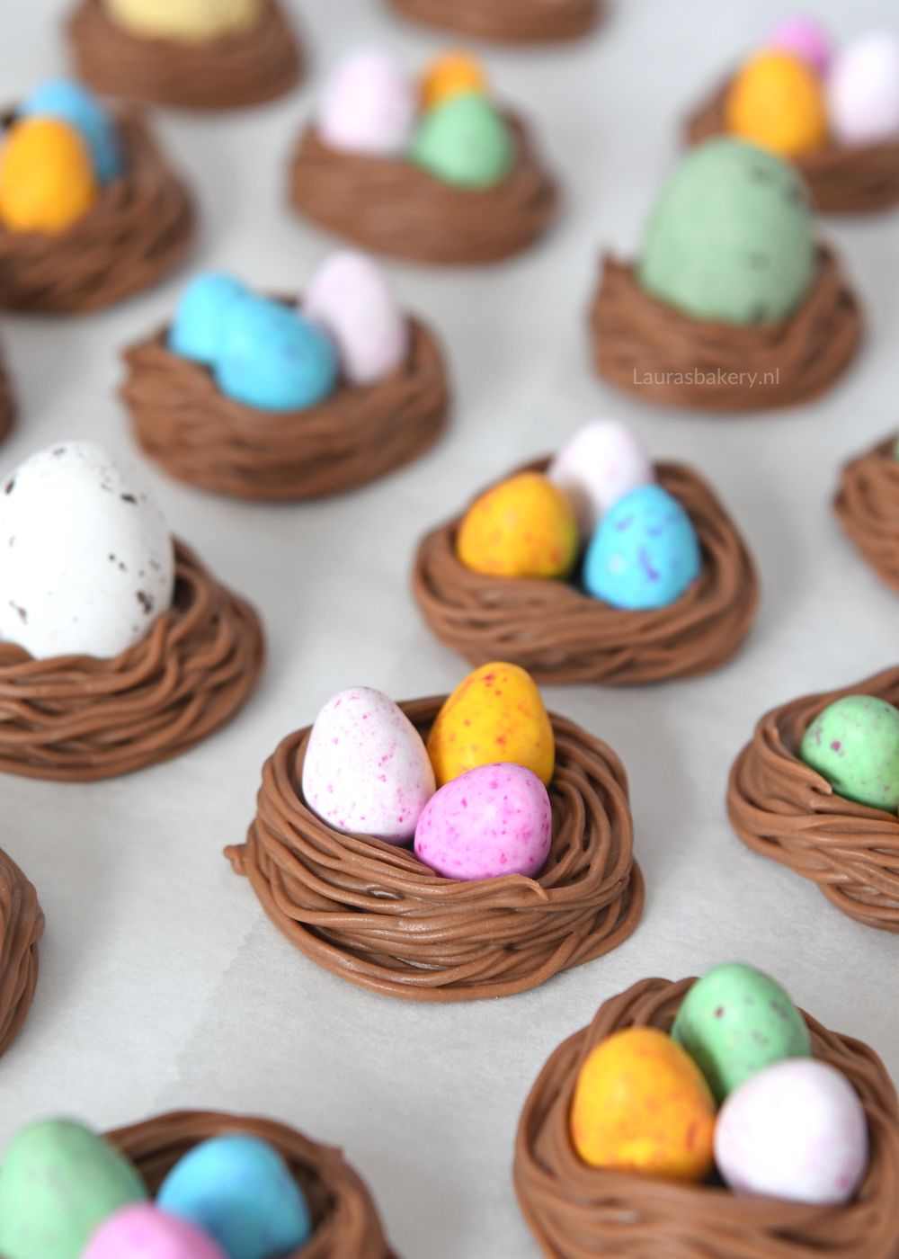 Small dragée eggs work best, but you can use any small chocolate eggs you like. One larger egg per nest also works nicely for a slightly different look.