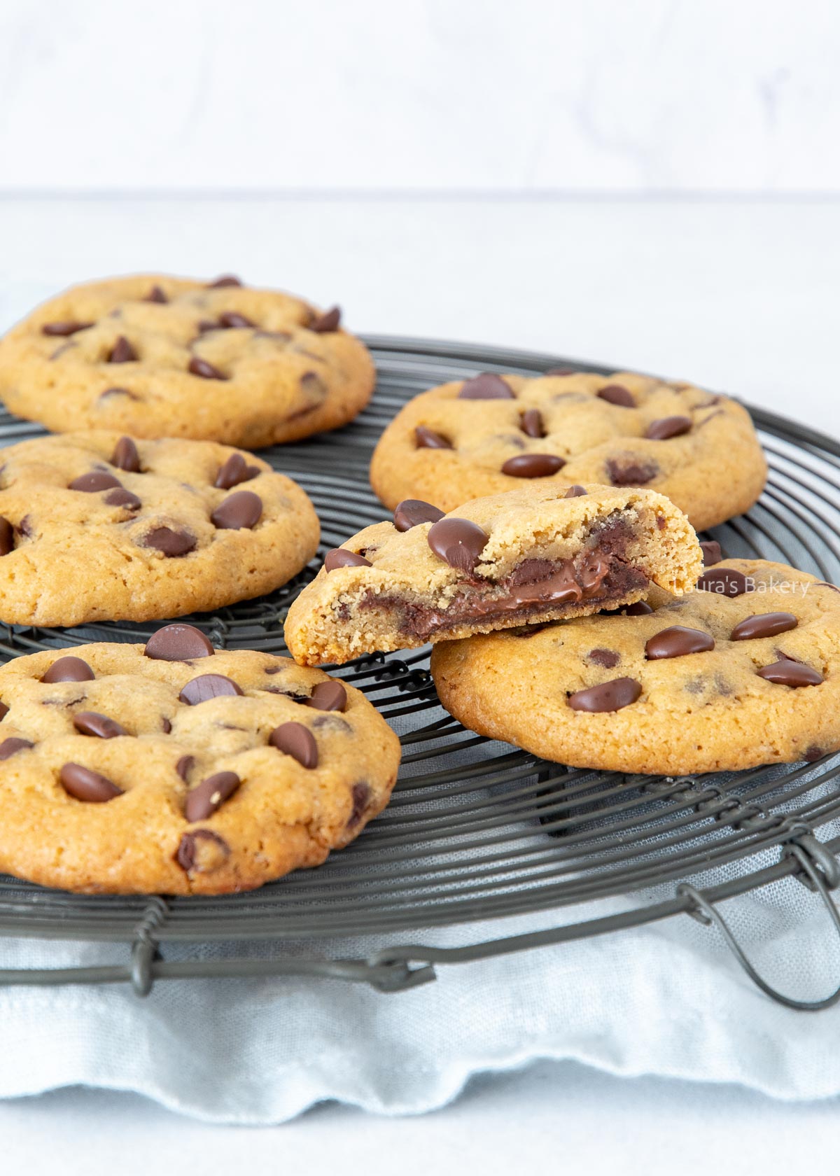 Place the dough balls on a baking sheet lined with parchment paper, leaving plenty of space between them, as these chewy cookies spread more than regular cookies because of the filling. Press a few extra chocolate chips into the tops.